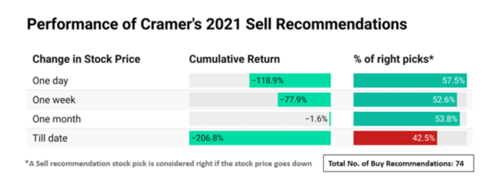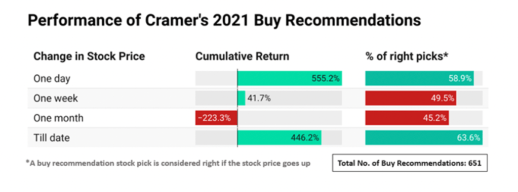 To that latter point, here’s something to chew on; do his picks only do well short-term but going any further out than a day or so become complete disasters? Out of 725 buy/sell picks he made throughout 2021, there were 651 marked as BUY and 74 as SELL. Here are a couple graphics we found on this which paint an interesting story: