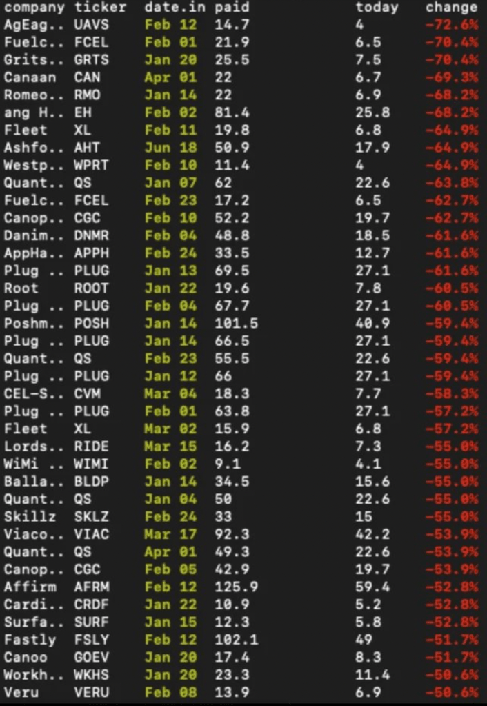 Below you will see a sample of his picks from the beginning of 2021 and how those picks have fared since. Yikes!