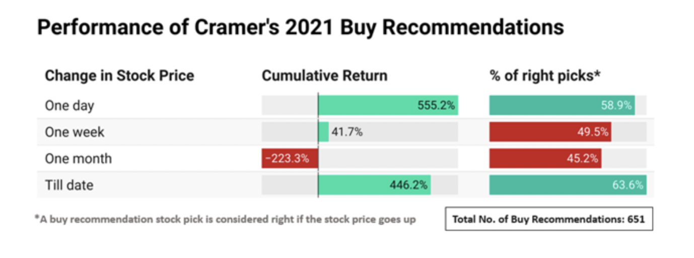 To that latter point, here’s something to chew on; do his picks only do well short-term but going any further out than a day or so become complete disasters? Out of 725 buy/sell picks he made throughout 2021, there were 651 marked as BUY and 74 as SELL. Here are a couple graphics we found on this which paint an interesting story: