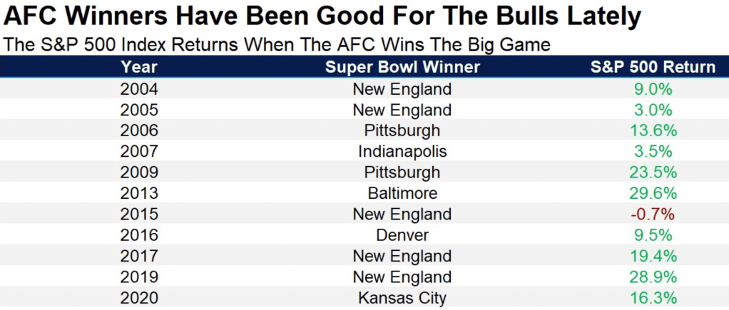 All kidding aside, and at the risk of upsetting any Los Angeles Rams fans, the AFC teams winning lately have been good for the bulls. What we’re talking about here is the Super Bowl Indicator. At a minimum this is a helpful article for you if you don’t have a “dog in the hunt” and your team lost weeks ago, never made the playoffs, or you could care less about football yet might be around people who do on Sunday.