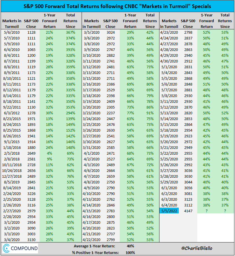 The above complication of data points based on when CNBC has aired similar “markets in turmoil” announcements points to the only market indicator with a perfect record. In every single instance the market was substantially higher 1-year later. Will it be different this time?