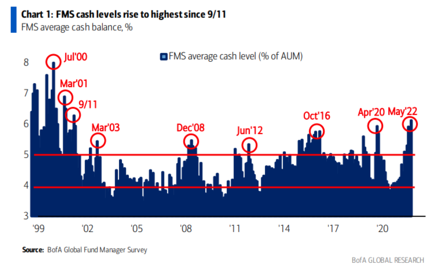 Investors have been sick to their stomachs for the entire year but we remind you that even though there are plenty of worries and headwinds…”it is always darkest before dawn“. The two charts below show you that sentiment is in the dumps and cash balances are as high as they’ve been since 9/11!