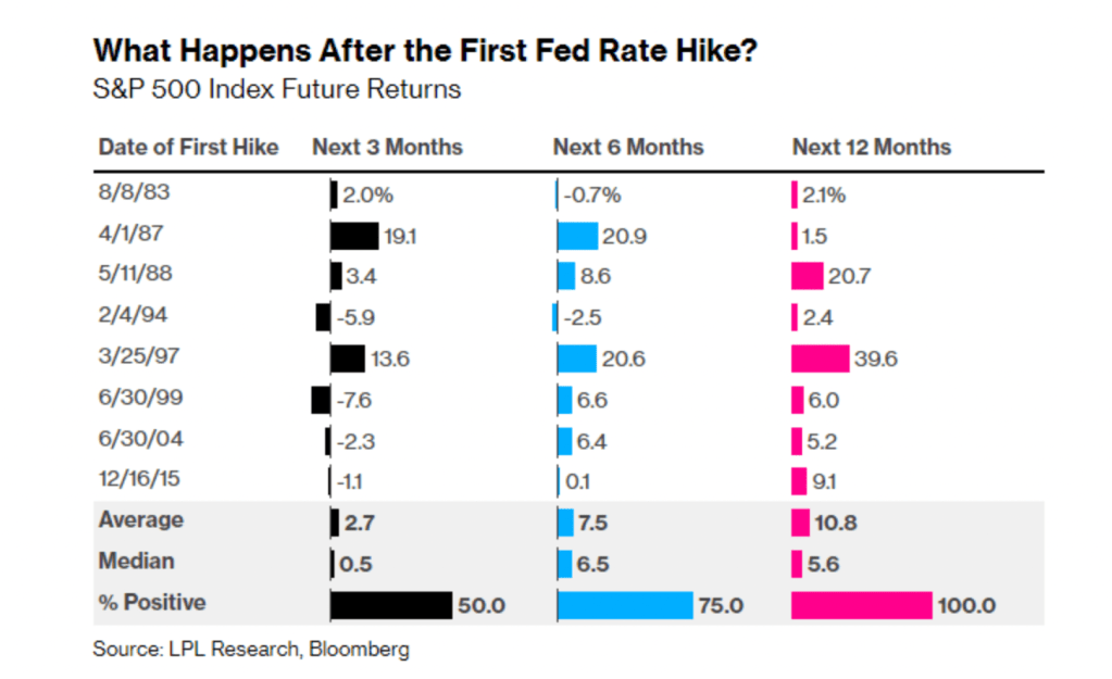 You already know of the main headwinds so we won’t dive into them in detail today. In short there are plenty….China, Covid/supply chain issues, Russia/Ukraine, inflation at 40 year highs. and Fed rate hikes. Speaking of the last one, guess what has happened 100% of the time following the first Fed rate hike? Will this time be the only one in history where the market does not finish higher 12 months later?