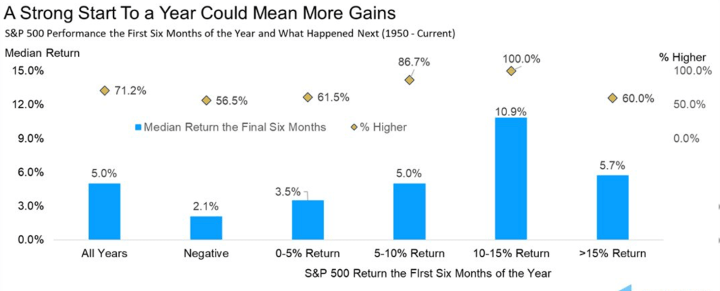 Starting off a year strongly also of course doesn’t necessarily guarantee the same finish but it certainly bodes well. Those that caved into emotion and sold out simply hurt themselves. We’re not playing the “I told you so game” but ask you to try and learn from this. Also be cognizant that more gains could be had even in light of some worrisome headlines. When the S&P 500 is up between 10% and 15% YTD as of the end of June, the rest of the year has been higher 12 out of 12 times and up a median of nearly 11%. The next six months average about 5% more to the upside.