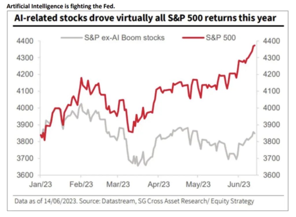 Oil– It’s really struggled. Artificial Intelligence (AI) – it’s rocketed to the moon. (click here if you want to review our 2023 outlook so this doesn’t come across as some rear view mirror type stuff) Yes…you’ll hopefully get it after reading all of this article or our past newsletters…but we’ve simply been more bullish than just about anyone out there. That said, we know it’s not all pretty under the hood. Matter of fact, speaking of all the rage that AI has been…check this chart out below. If you strip out AI stocks the S&P 500 is not doing that great.