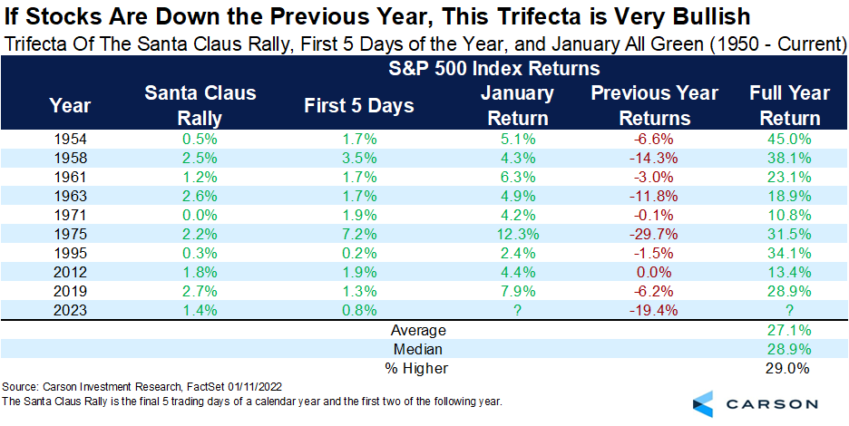 We wrapped up January in surprisingly good fashion (again…almost everyone got it wrong but we’ll modestly remind clients we did not). Couple that with what is the proverbial “Santa Claus” rally period and you have some interesting history to look at. When stocks are lower the year prior, but gained during the Santa Claus period and first five days of January…we’ve seen a market average +27% the next year. Could it happen this time? Maybe not to that extent but if it doesn’t it will be the first time ever it didn’t at least go higher (nine for nine prior).
